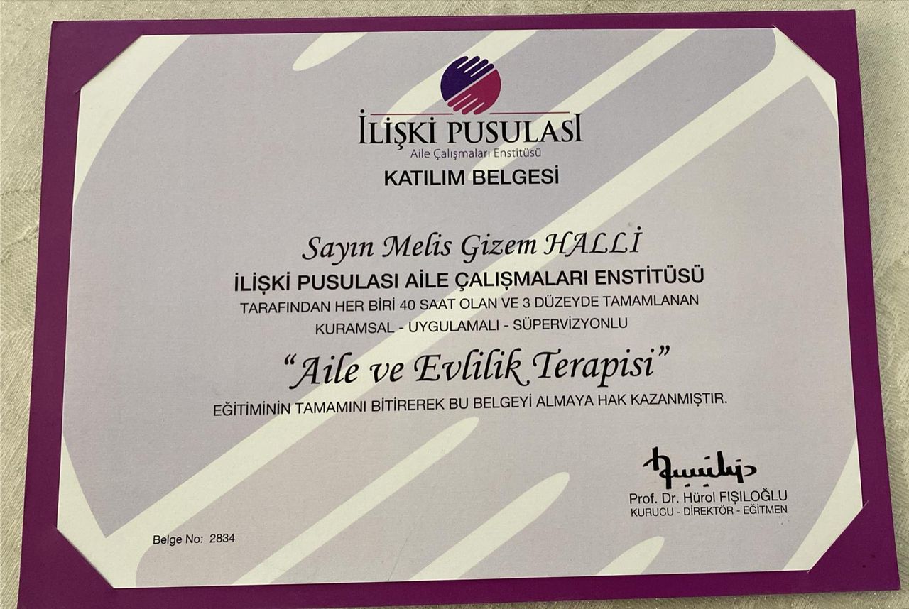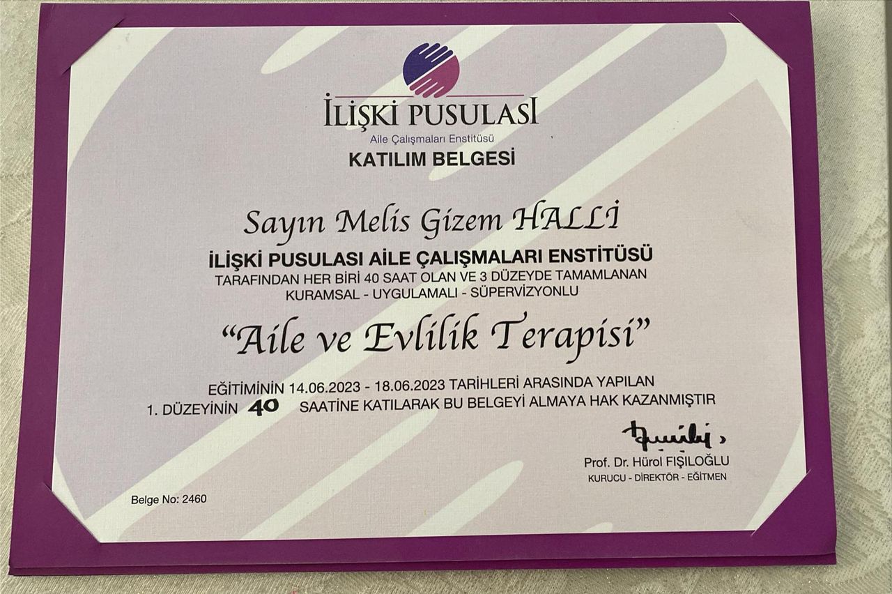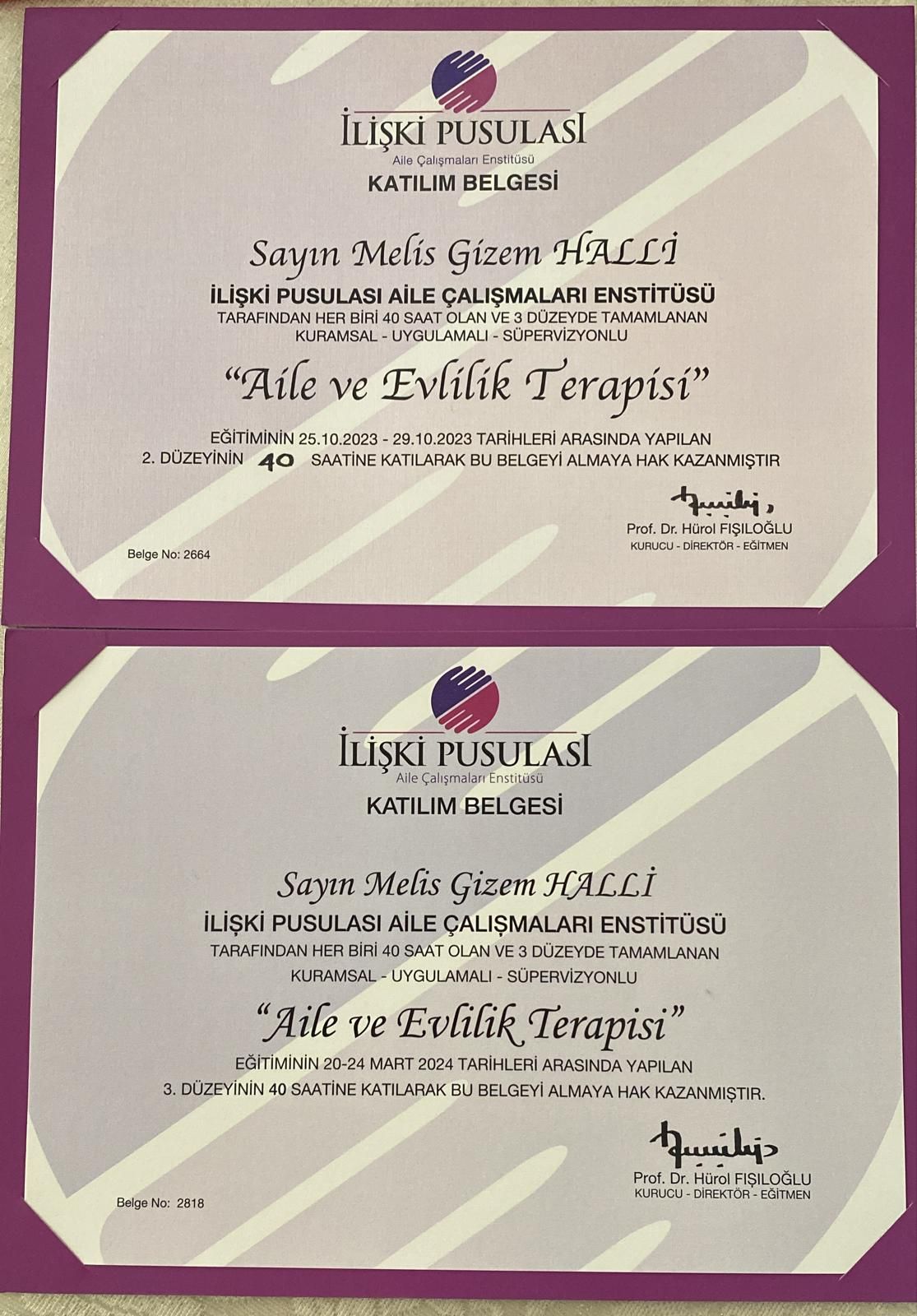 Haziran 2023 – Mart 2024 tarihleri arasında Prof. Dr. Hürol Fışıloğlu’ndan Aile ve Evlilik Terapisi Eğitimi aldım. Bu eğitim kapsamında kuramsal, uygulamalı ve süpervizyon süreçlerini başarıyla tamamladım. Çift terapilerimde İlişki Pusulası Modeli’ni temel alıyorum. Ağustos 2023 – Haziran 2024 döneminde Terappin çevrimiçi terapi platformunda farklı yaş gruplarından danışanlarla bireysel çalışmalar yürüttüm.